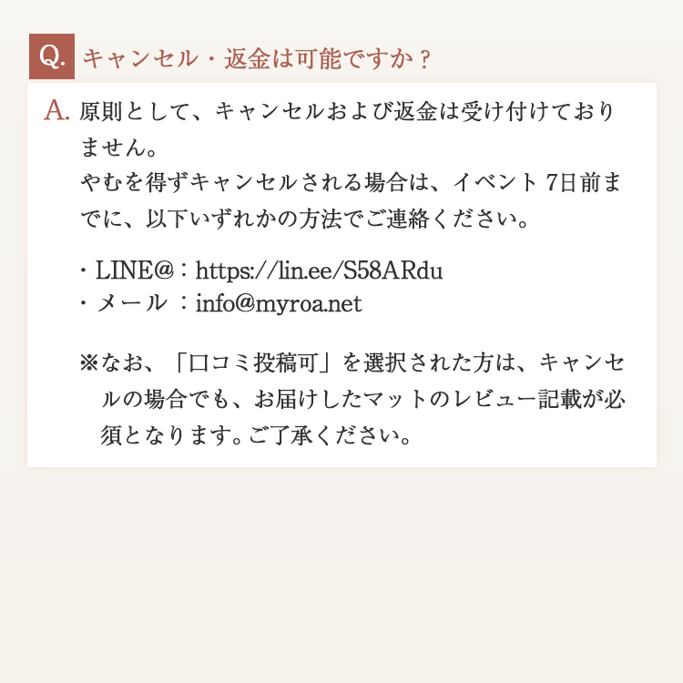 ・연락이 없는 캔슬이 계속되었을 경우, 다음 번 이후의 참가를 조정하는 일이 있습니다. 아무쪼록 이해해 주시면 감사하겠습니다.